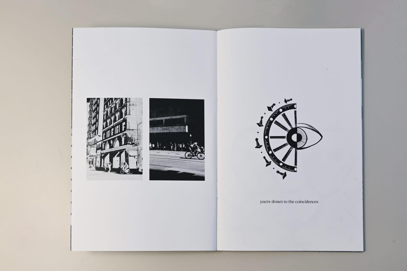 Originally the idea was formed in 2023 as an experiment in sequencing – instead of following the conventional emphasis on contrast, it stems from a simple question ‘what if repetition is the theme?’ Featuring pairs of photos that share unplanned compositional similarities regardless of time and place taken, and accompanied by dreamlike illustration, the zine is a visual metaphor of repeating events in life and lets readers focus on forms and rhythms, and contrasts of reality and subconscious loops.