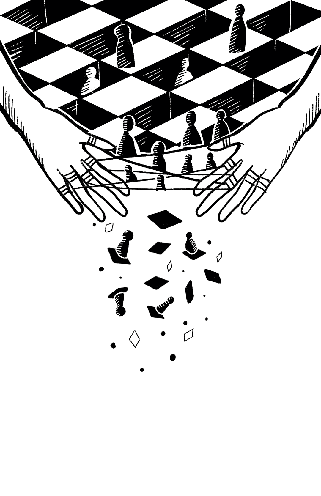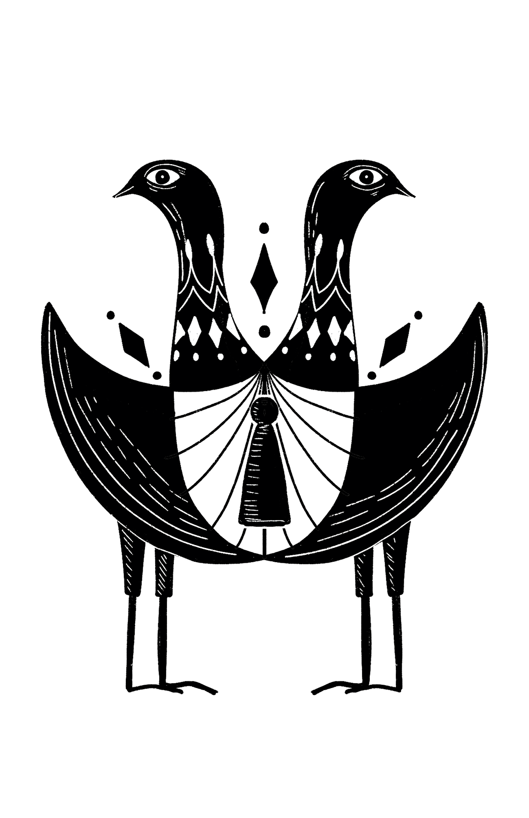 So now we have the theme and main visual elements (the diptychs), but how do we connect everything into a book? First the whole zine and all the images are in black and white to force readers focus on the compositions and repetition. Second, surreal illustrations inspired by the elements / compositions of photos are added. For instance, the details of first pair of photos (two images depicting people walking the ground with straight line-like shadows and painted lines) resemble grid lines and checkers. This inspired me to create a chessboard that is made of threads tied on fingers, representing the uncertainty of encounters in life that sometimes are believed to be controlled by fate / a higher being. Another key visual is a pair of dancing birds with same appearances, a direct representation of the doppelgängers and the entanglement.