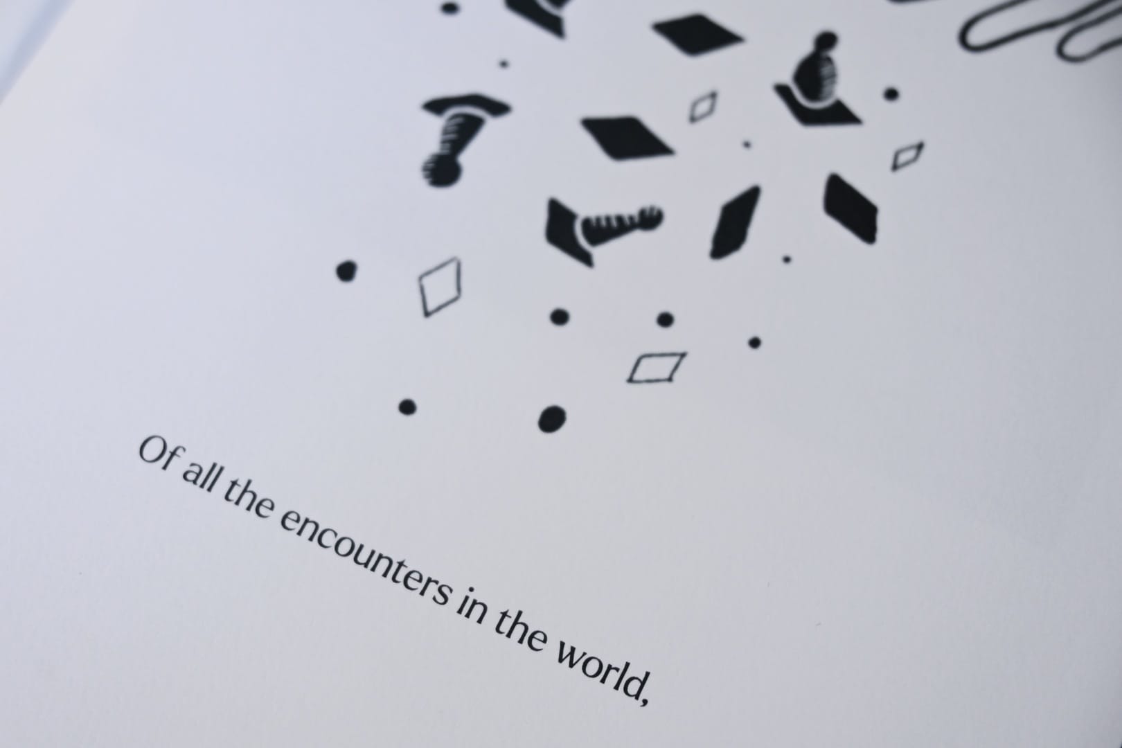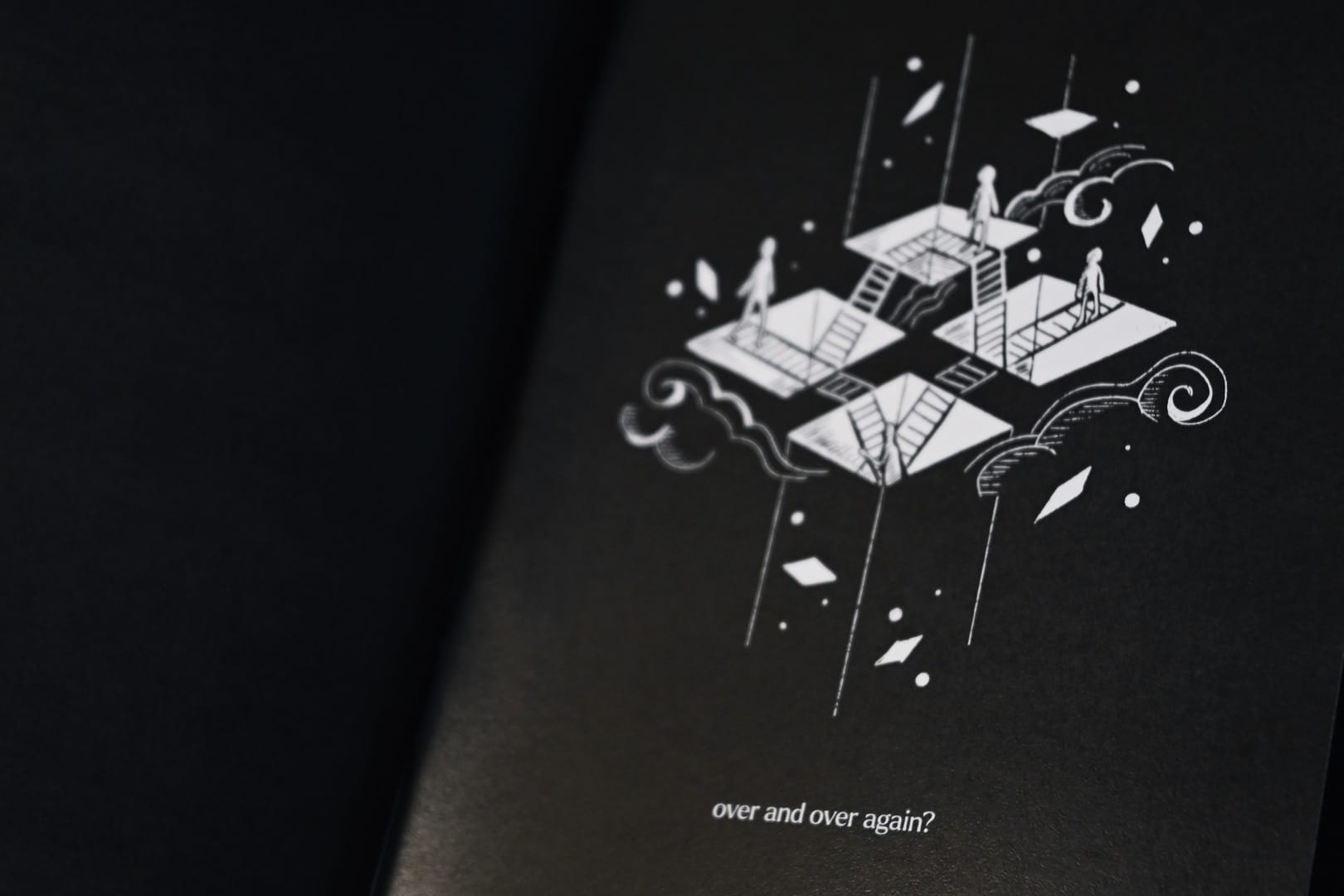 As for typography and text, I decided to keep it minimal. Three sentences, presented in clean serif, become the main message – 'of all the encounters in the world, you're drawn to the coincidences. Of all the faces you've met, you walk and dance with the doppelgängers. How does it feel to be in the same moment over and over again?' It tells the story but without any judgement, it's here to let readers face their own feelings and situation, a crucial step to break away from the personal stagnation or recognizing the trauma.