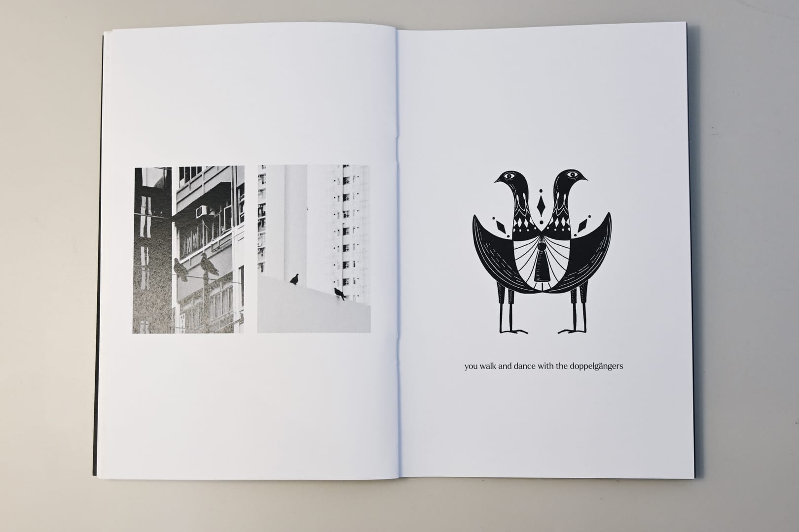 Have you ever been to places and met people that feel familiar yet they are totally unrelated and different? Have you ever been in similar situations, particularly the undesirable ones repeatedly? Do you feel that the feelings are indescribable but need to let it all out? Inspired by raw realizations of my life, my zine Doppelgängers aims to articulate the predicament of getting stuck in the same situation over and over again, whether it is by chance or by unconscious choice. It is also about how psychological trauma and the unhealthy coping mechanism induced by it are manifested. With a series of photo diptychs and black and white surreal illustration, it lets you immerse in the world of powerlessness and lead you to the realization that stagnation is not always a fate, but sometimes imposed by ourselves unknowingly.
