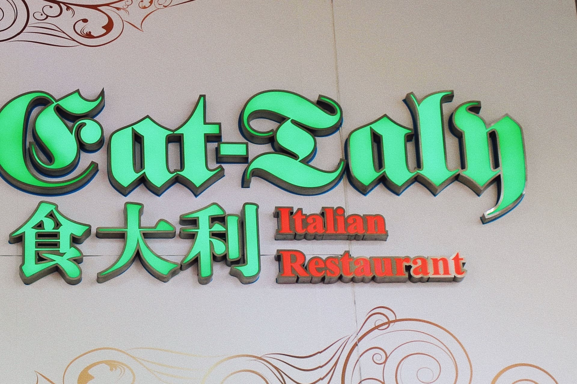 examples of misuse and separation of cultural symbols and origins , fig.1 an Italian restaurant shop sign adopting blackletter, fig.2 an western restaurant using Italian phrases as shop name, fig. 3 a mobile gadget shop using Japanese character in shop sign, fig.4 a lounge using buddha as the name and Celtic typeface, in which alcohol is forbidden in buddhist teaching and the typeface has nothing to do with the business, fig.5 the name of the nightclub is ‘Venice’, which has nothing to do with the business