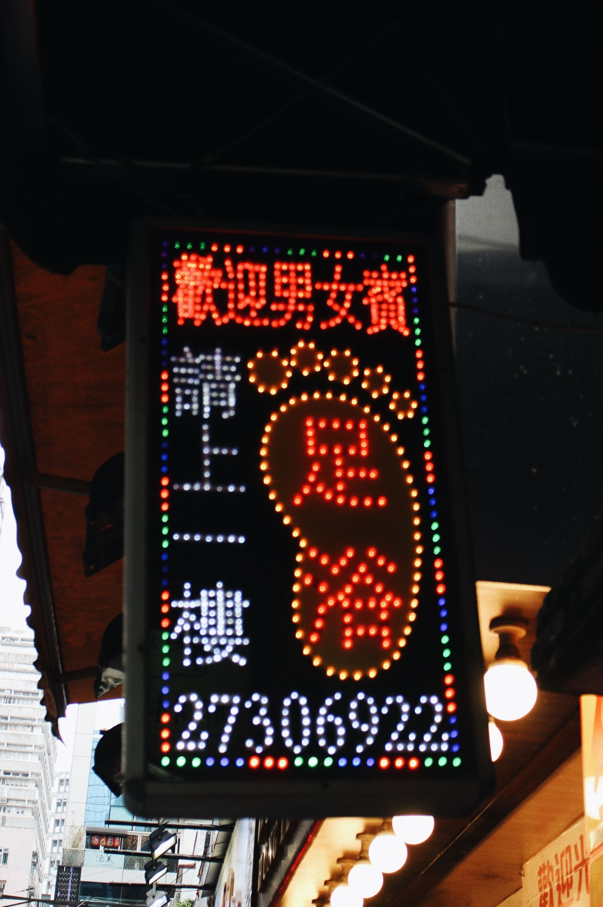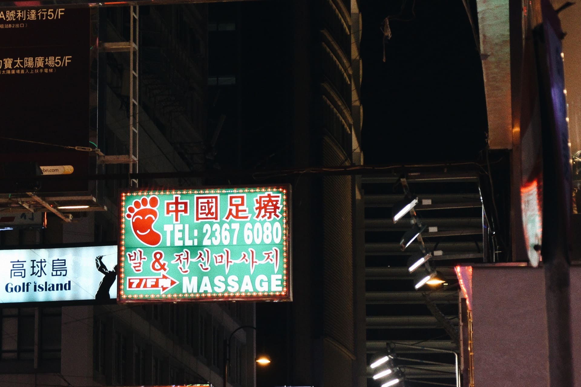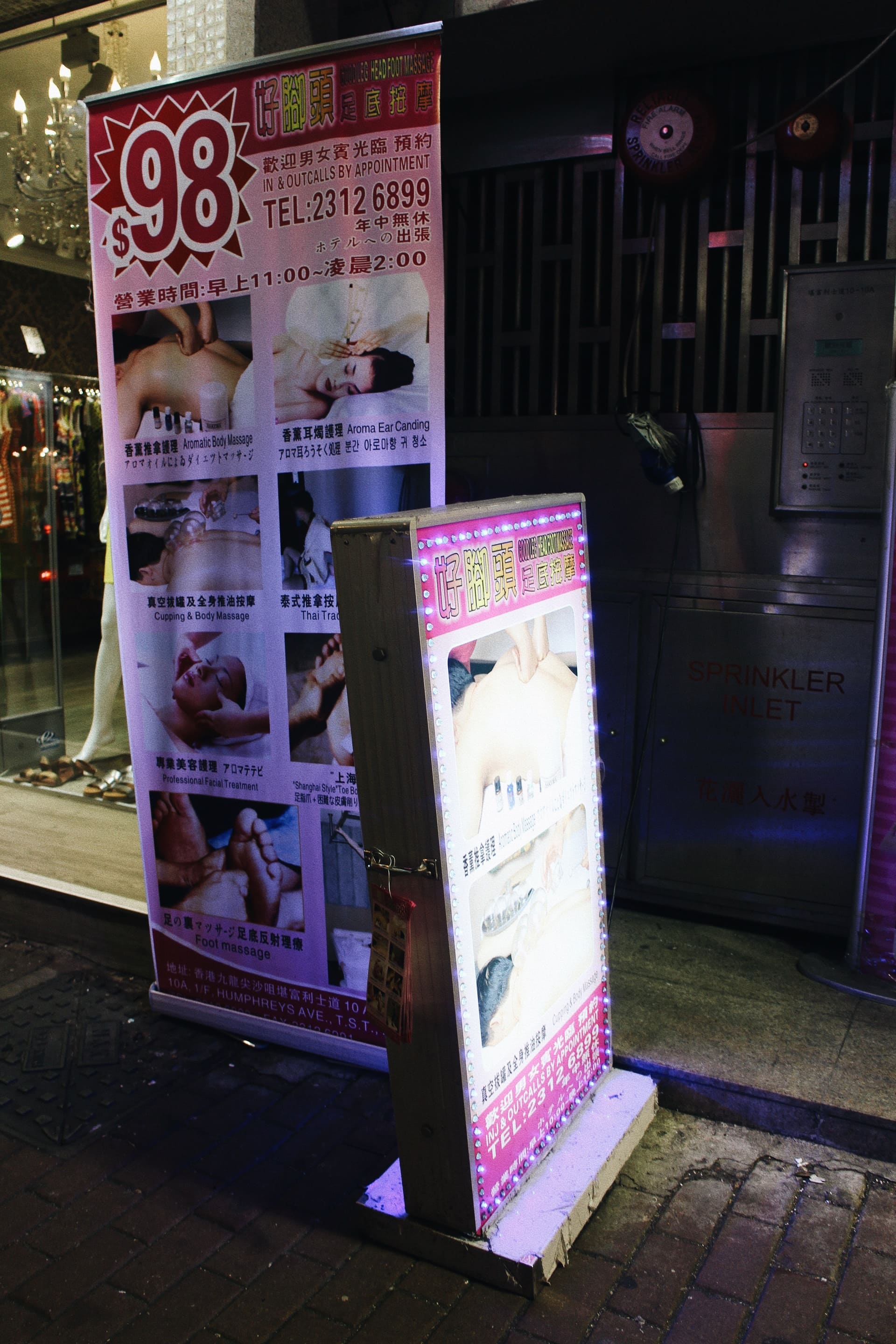 Body massages are popular in Hong Kong. While some run them in chain stores, a lot are operated on a small scale. Shops providing affordable massage are usually located on upper floors of old buildings. The shop owners may place a plastic lightbox near the staircase of the building to inform and attract customers. A small signage may also be hung from the building. A roll-up banner with photos of service may also be set up. It is said that if a foot massage shop provides erotic service, there will be a foot with a smiling face on the sign, but so far the statement is not supported with evidence .