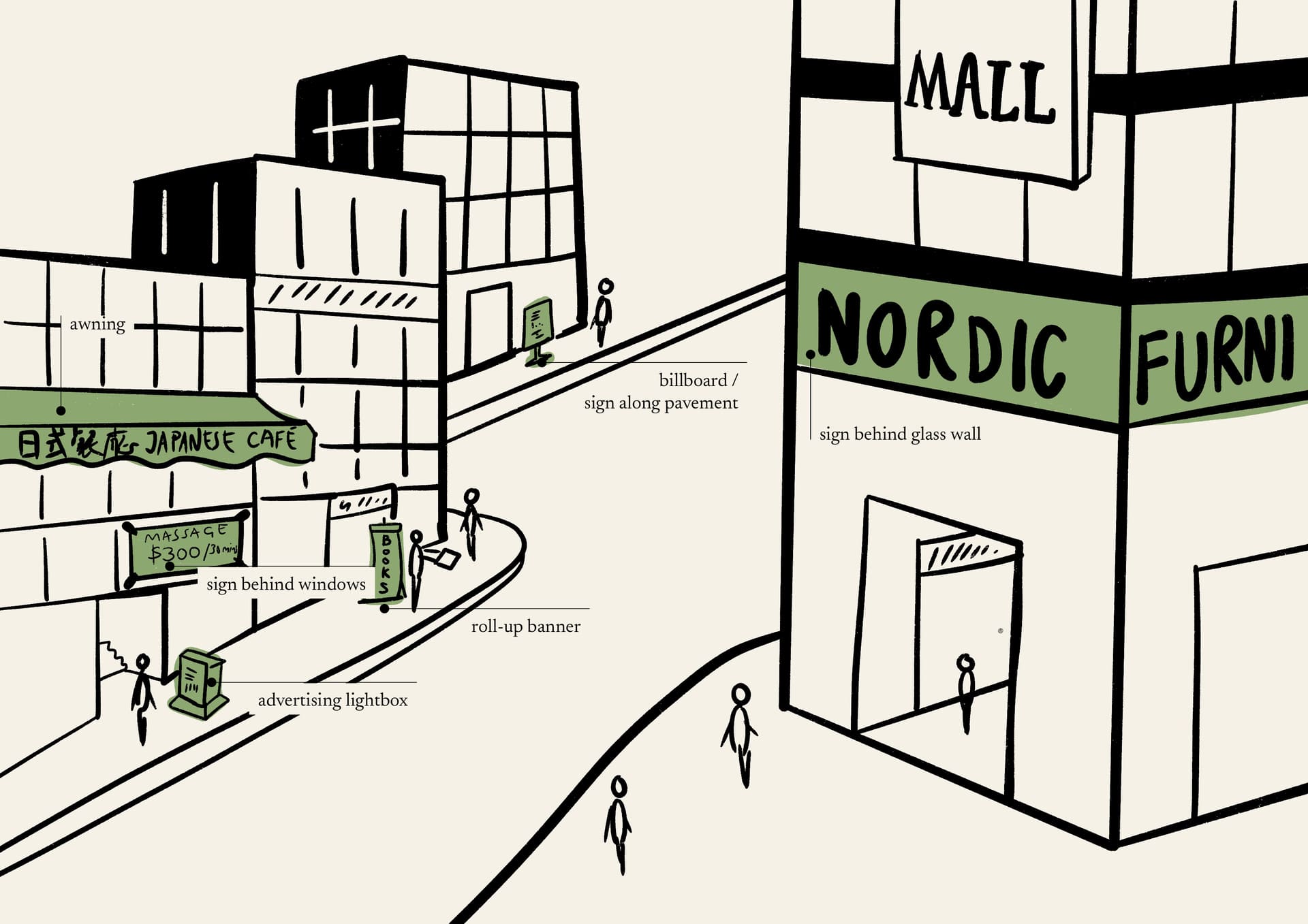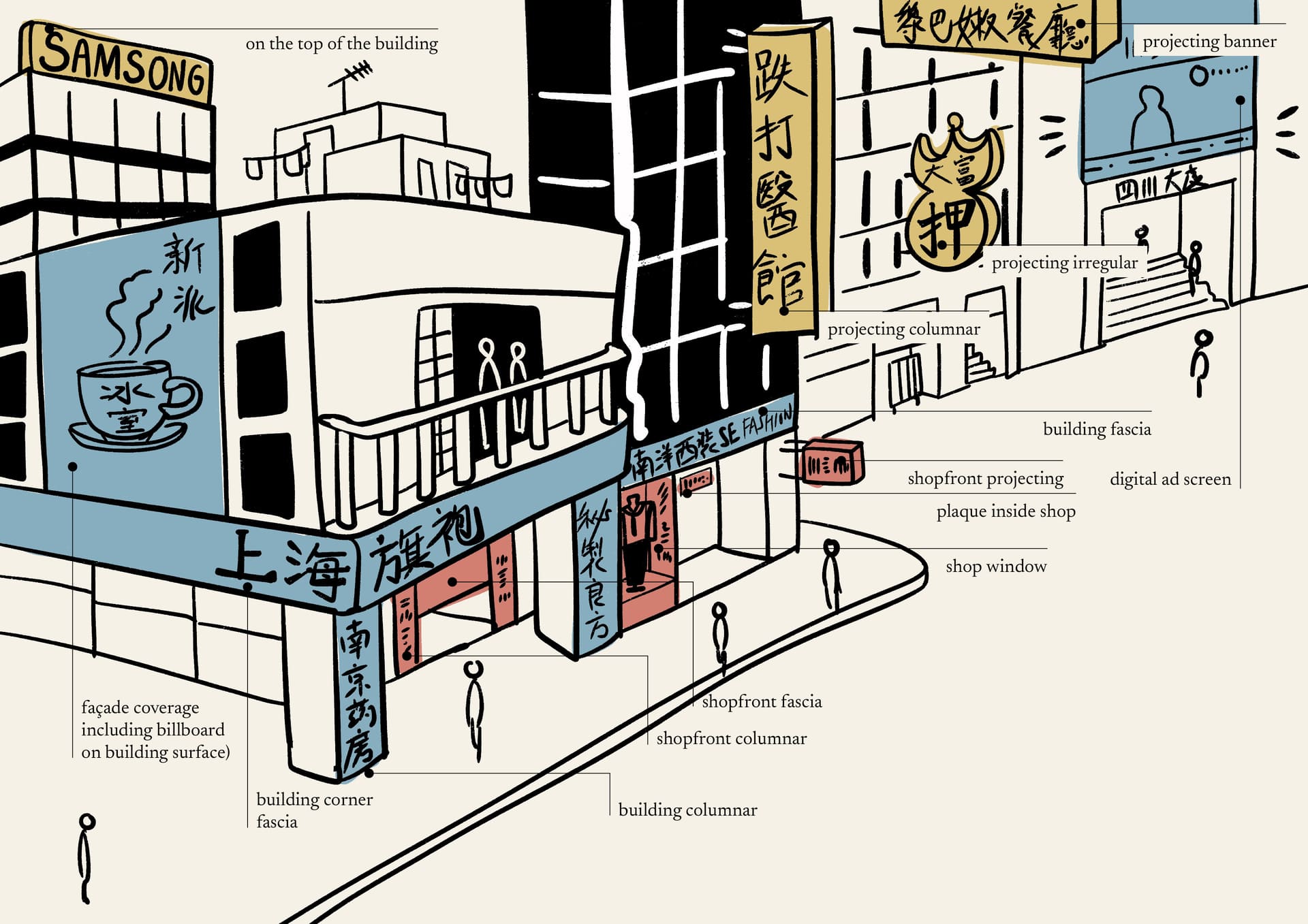 The shop signs can be adhered as extension of the buildings, (on the top of the building, projecting columnar, projecting irregular, and projecting banner), and be placed on the buildings (façade coverage (including billboard on building surface), building corner fascia, building fascia, building columnar, and digital advertising screen. These are viewed from far away. The ones on shopfronts (shopfront columnar, shopfront projecting, shopfront fascia, shop window, plaque inside shop) are to be viewed closely.