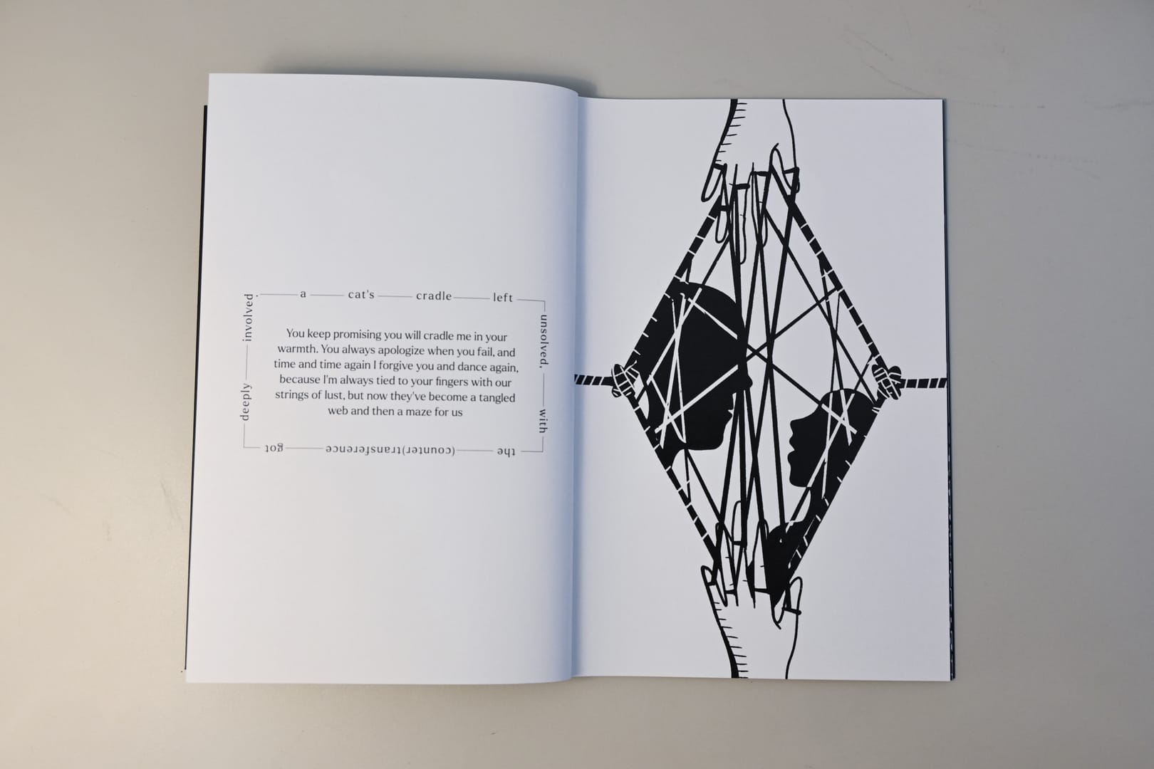The project explores the collision between the client’s dark secrets and transference and the therapist’s countertransference — his unspoken desire for control and subsequent punishment of the client for failing to 'support' him during his hard times. With eerie photos, striking black and white surreal, sometimes sensual illustrations, and experimental typography, the zine is a brutal depiction of emotional entanglement and how therapeutic trust, when exploited, can descend into a grotesque power play.