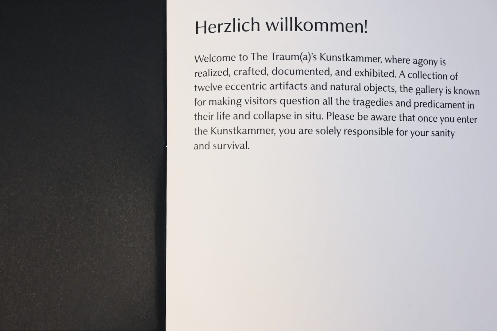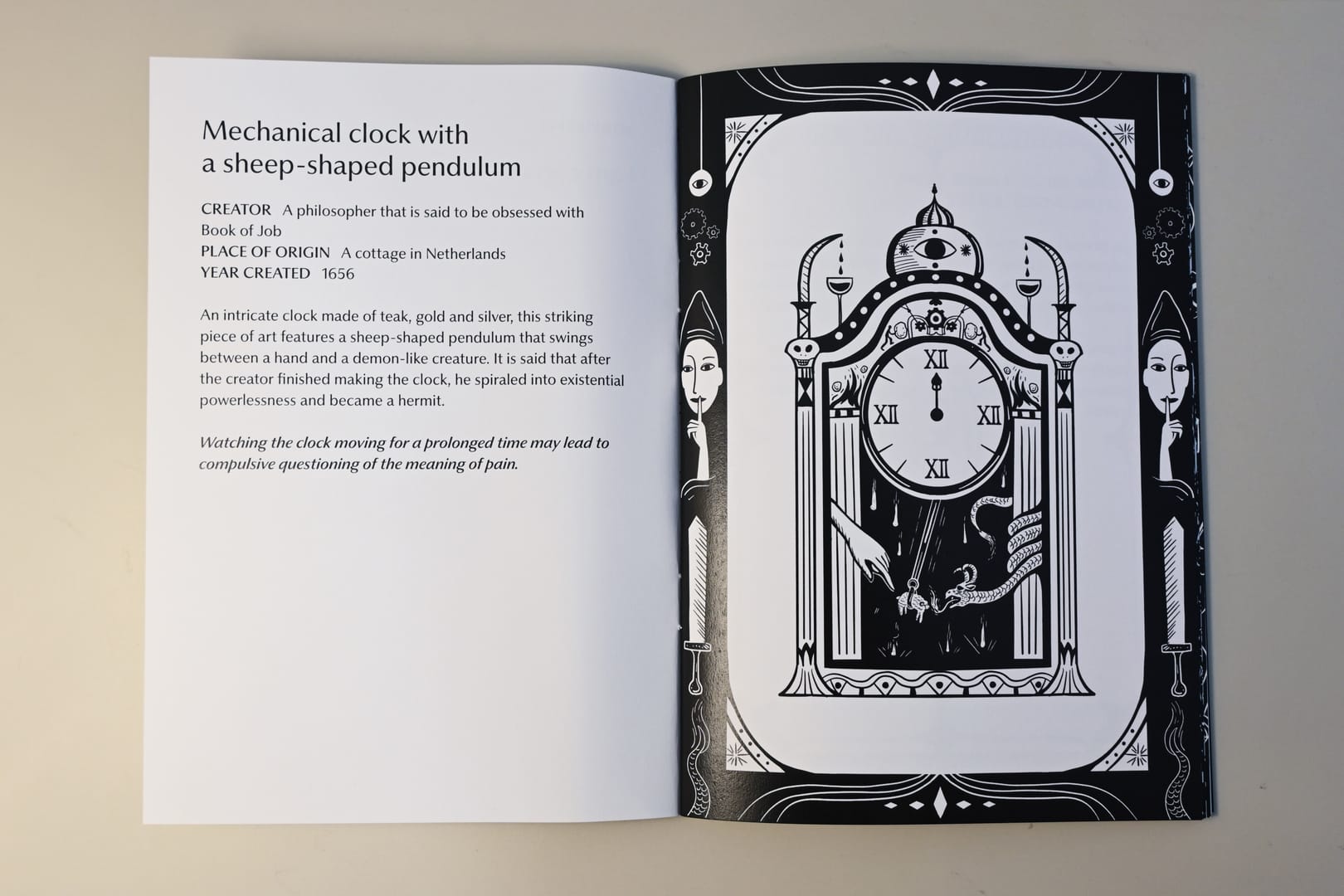 The project is completed in 2025, but the seed was planted back in 2011 – the therapist asked me how I would describe and name my OCD. I said metronome, which symbolized the repetitive and mechanical nature of compulsions. Fast forward to 2024 / 2025, I found my drawings always gravitated to the dark and grotesque side – no matter how cheerful or peaceful I wanted the subject to be, it always turns out unsettling. A few drawings later I sensed the potential of developing the drawings into a series. Entering Kunstkammer, the 16th-century European chambers showcasing unusual natural and artificial objects. The drawings and the concept clicked instantly. Later the zine adopts a three-act framework that echoes trauma's life cycle – 1) the happening of trauma, 2) the aftermath and disorder, and 3) realization and healing. Presented as a museum pamphlet fused with dark humour, the stark contrast of clinical coldness and fiery anguish is set to make readers uncomfortable and immerse in the world where logic distorts, perception is challenged and only feelings make sense.